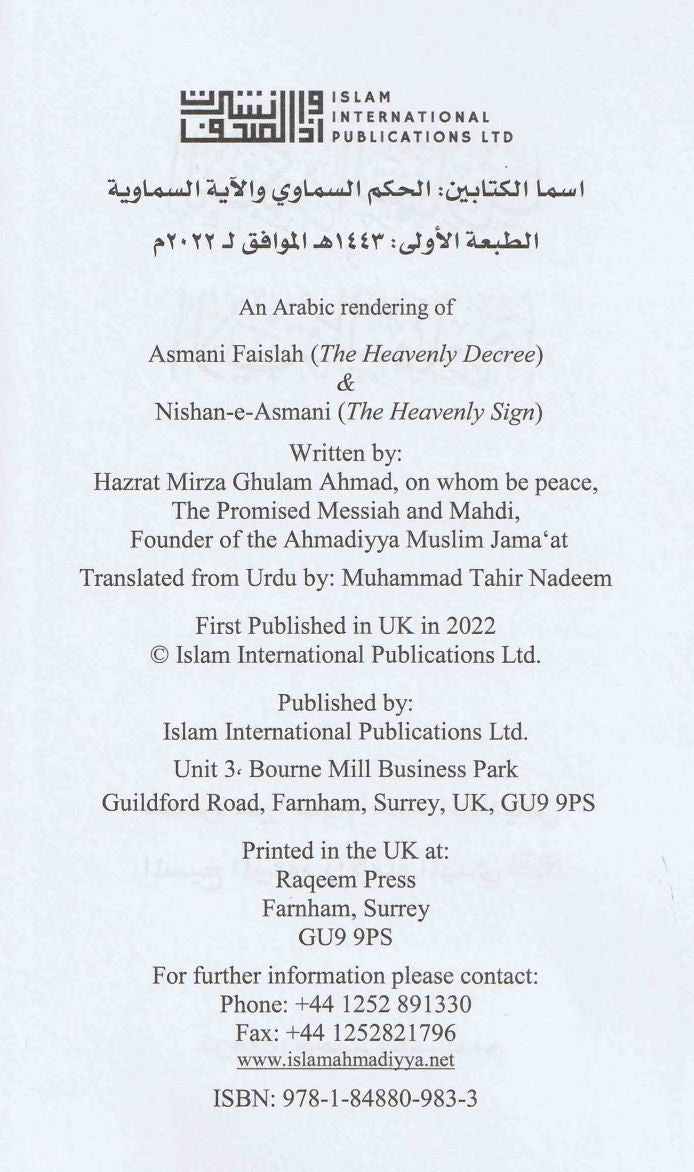 Aasmani Faislah and Nishan-e-Aasmani in Arabic الحكم السماوي والآية السماوية